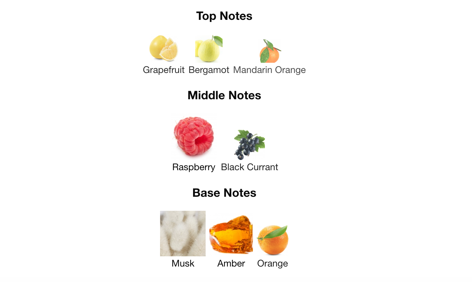 Top notes are Grapefruit, Bergamot and Mandarin Orange