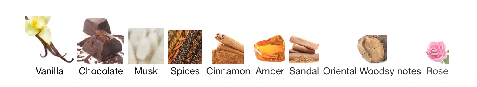 Notes - Vanilla, Chocolate, Musk, Spices, Cinnomon, Amber, Sandal Oriental Woodsy Notes, and Rose.