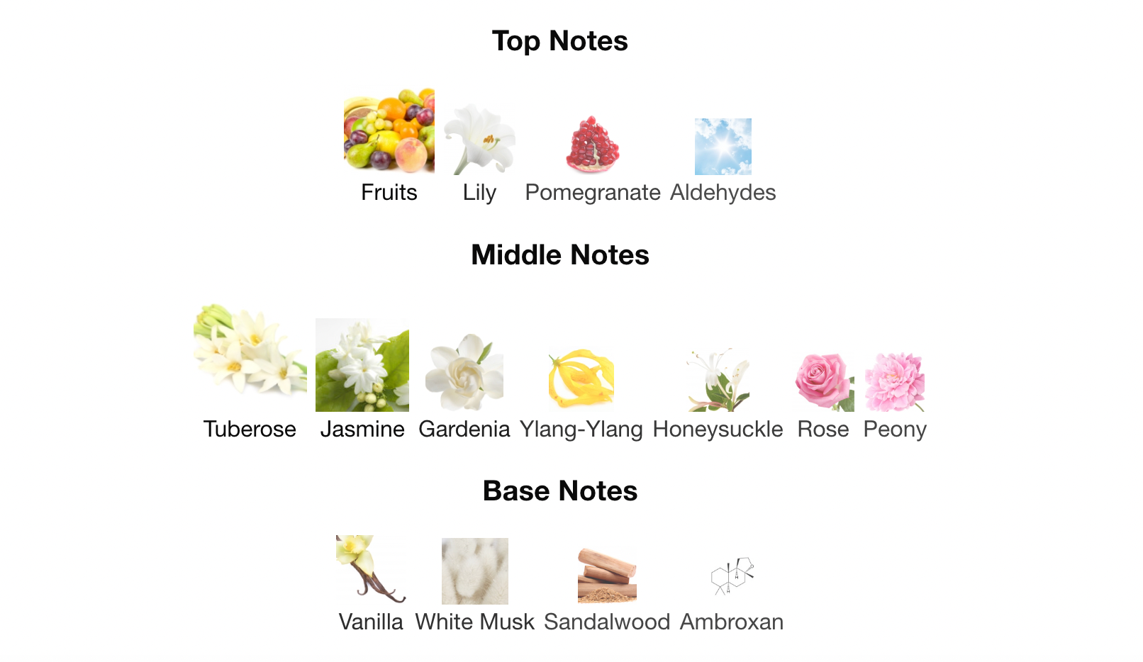 Middle notes are Tuberose, Jasmine, Gardenia, Ylang-Ylang, Honeysuckle, Rose and Peony